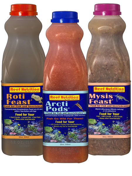 Concentrated Zooplankton with something for EVERYONE! Pack includes 16 oz bottles of Roti-Feast®, Arcti-Pods® and Mysis-Feast®.
