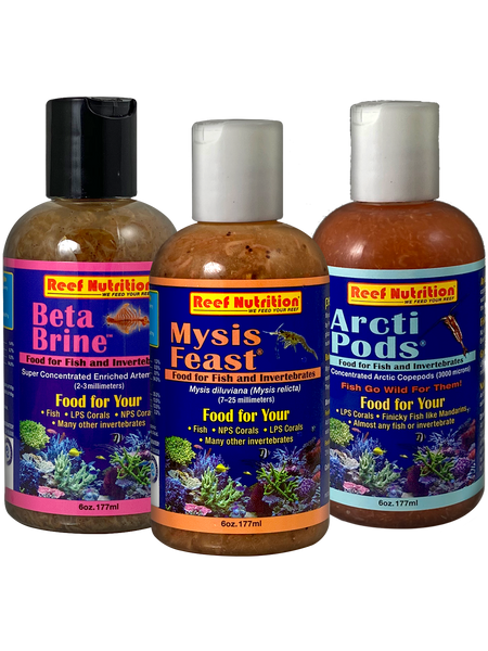 What do Seahorses eat? Reef Nutrition’s Mysis-Feast®, a concentrate of PE Mysis shrimp high in omega fatty acids, is an excellent first choice. Arcti-Pods® (arctic copepod concentrate) is naturally rich in carotenoids for brighter colors, plus protein, omega fatty acids, and waxy esters for growth.