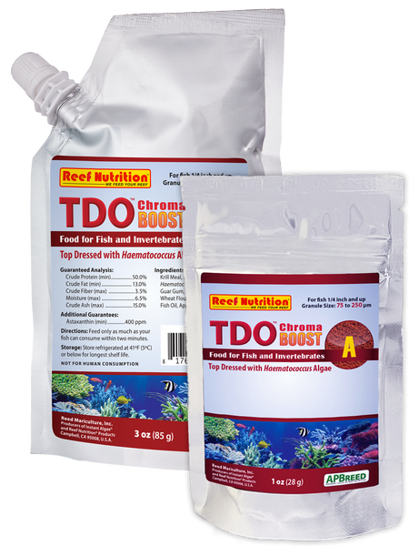 TDO Chroma Boost™ is another smart choice for feeding zoaanthids. Available in multiple sizes, the nutritionally dense pellets that have been top-dressed with Haematococcus pluvialis are the perfect size for target feeding.